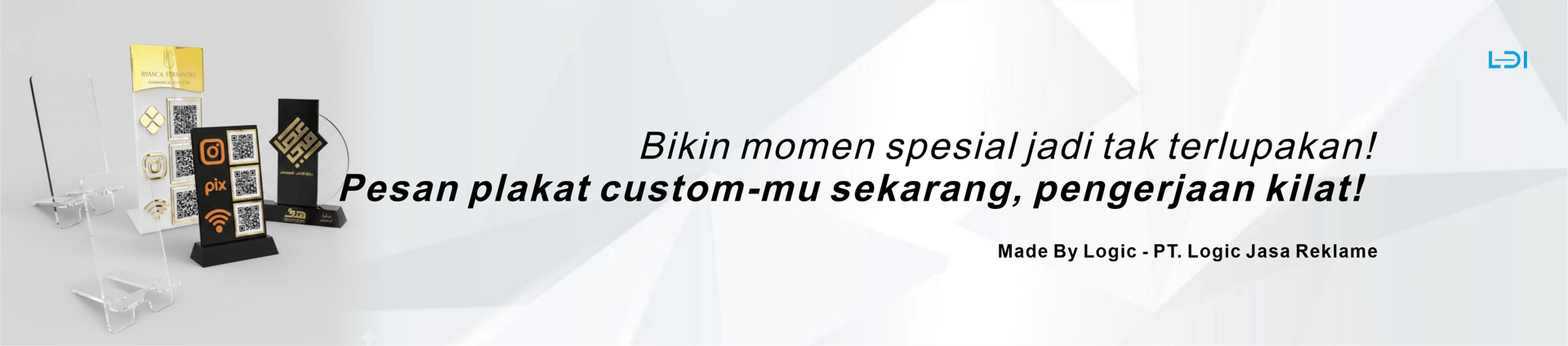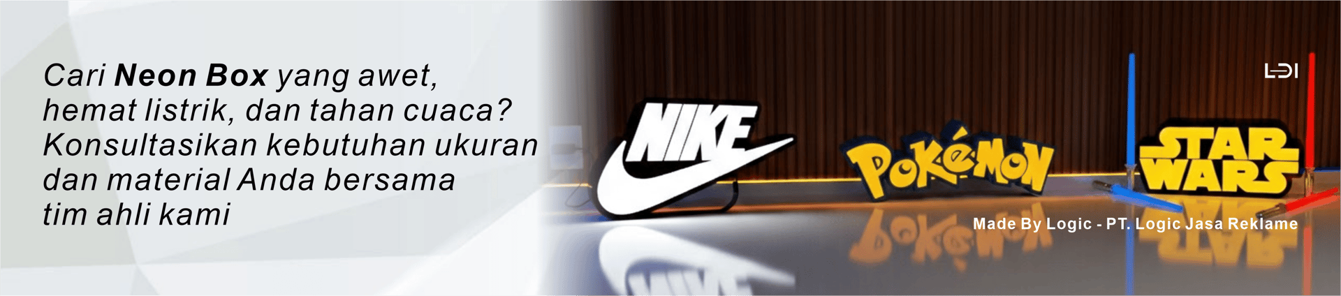 PT. Logic Jasa Reklame adalah perusahaan yang melayani jasa pembuatan Kerajinan Akrilik, Neon Flex, Neon Box, Huruf Timbul (3D-Letter), Laser Cutting Acrylic dan Cutting Sticker untuk berbagai keperluan baik bisnis maupun perorangan.